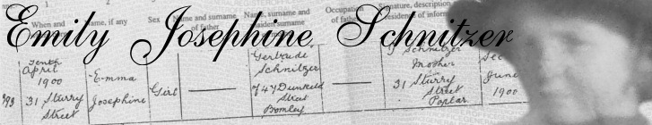On 10th April 1900 Emma Josephine Schnitzer was born at a charitable maternity home - Manor Cottage at 31 Sturry Street, Poplar, East London (off the East India Dock Road and close to Canary Wharf). The home, established in 1878, is described in Herbert Fry's Royal Guide to the London Charities, published 1917, as a place "to assist young women of previous good character to a new start in life, especially those who, not necessarily depraved, are about to become mothers for the first time. These are confined at the home and then helped into a position to support their little ones."